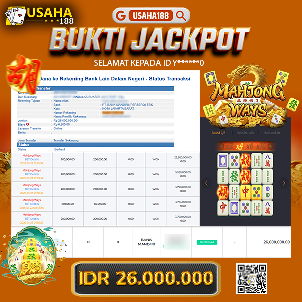 USAHA188 Merupakan Situs Slot Gacor Terpercaya Yang Kembali Menghadirkan Kemenangan Murni Pada Member Y******0 Pada Permainan Mahjong Ways Dengan Total Kemenangan Rp 26.000.000,- Dibayar Penuh Tanpa Potongan