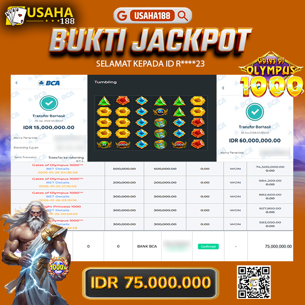 USAHA188 Merupakan Situs Slot Gacor Terpercaya Yang Kembali Menghadirkan Kemenangan Murni Pada Member R****23 Pada Permainan Gates Of Olympus 1000 Dengan Total Kemenangan RP. 75.000.000,- Dibayar Penuh Tanpa Potongan