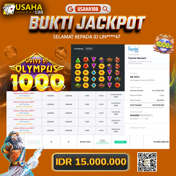 USAHA188 Merupakan Situs Slot Gacor Terpercaya Yang Kembali Menghadirkan Kemenangan Murni Pada Member Lin****47 Pada Permainan Gates Of Olympus 1000 Dengan Total Kemenangan RP. 15.000.000,- Dibayar Penuh Tanpa Potongan
