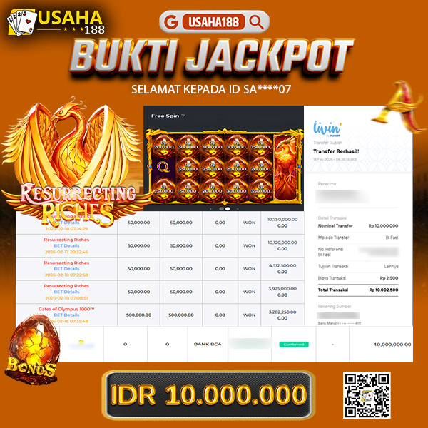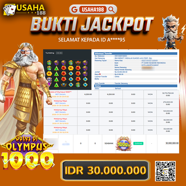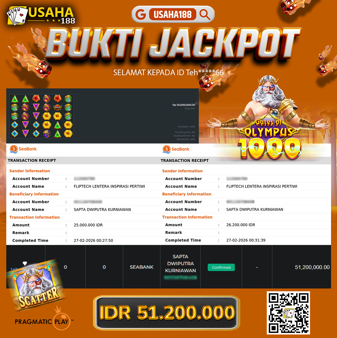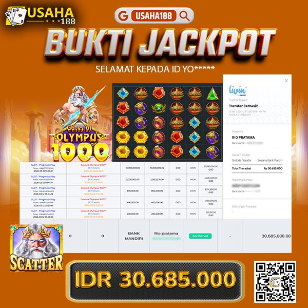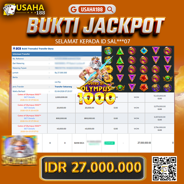 USAHA188 Merupakan Situs Slot Gacor Terpercaya Yang Kembali Menghadirkan Kemenangan Murni Pada Member Sal***07 Pada Permainan Gate Of Olympus 1000 Dengan Total Kemenangan 27.000.000,- Dibayar Penuh Tanpa Potongan