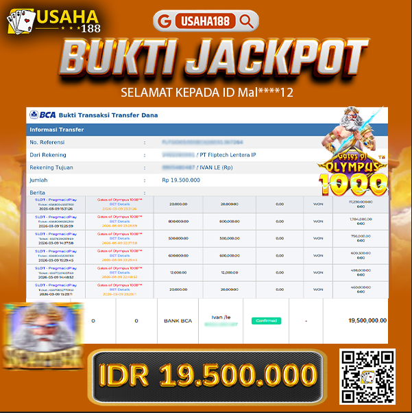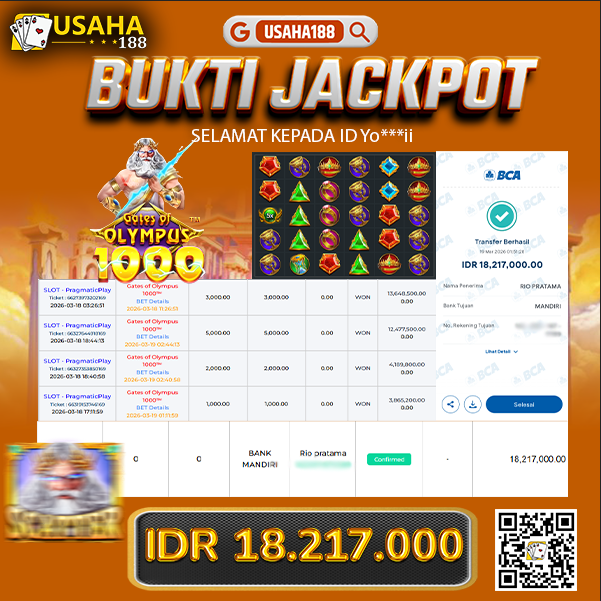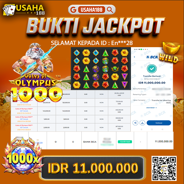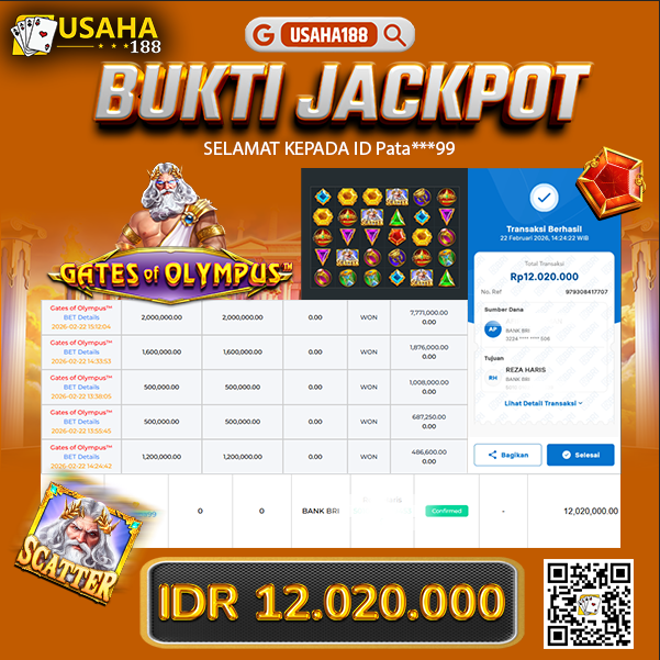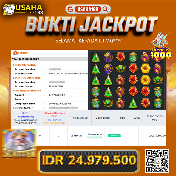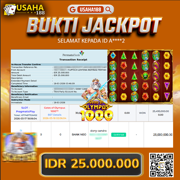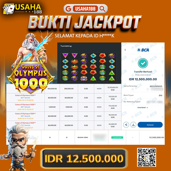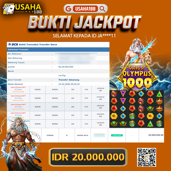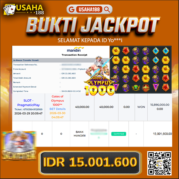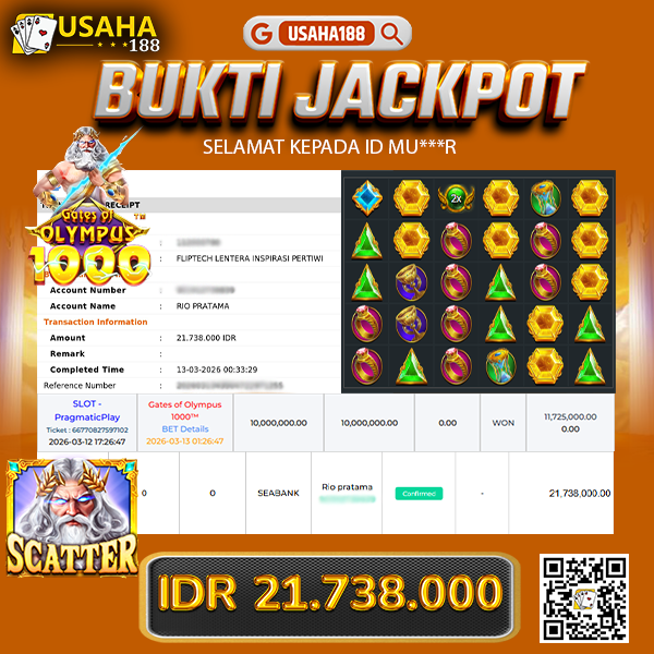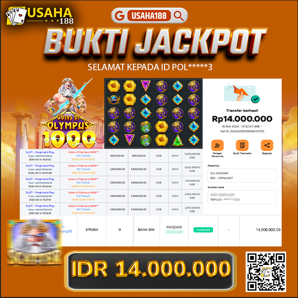 USAHA188 Merupakan Situs Slot Gacor Terpercaya Yang Kembali Menghadirkan Kemenangan Murni Pada Member Yo***i Pada Permainan Gate Of Olympus 1000 Dengan Total Kemenangan 15.001.600,- Dibayar Penuh Tanpa Potongan
