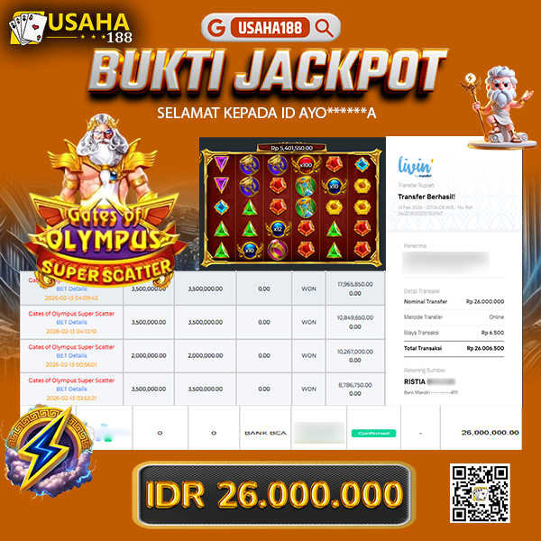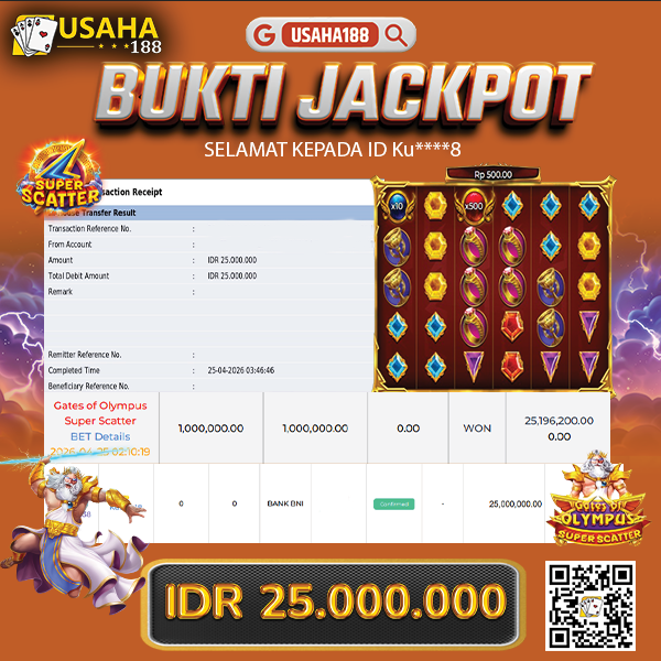 USAHA188 Merupakan Situs Slot Gacor Terpercaya Yang Kembali Menghadirkan Kemenangan Murni Pada Member Ku****8 Pada Permainan Gate Of Olympus Super Scatter Dengan Total Kemenangan 25.000.000,- Dibayar Penuh Tanpa Potongan