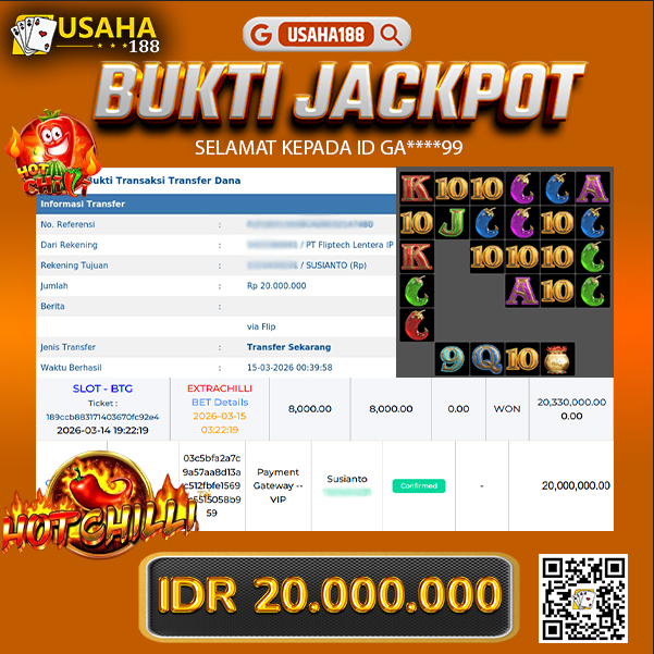 USAHA188 Merupakan Situs Slot Gacor Terpercaya Yang Kembali Menghadirkan Kemenangan Murni Pada Member G****9 Pada Permainan Extrachili Dengan Total Kemenangan 40.000.000,- Dibayar Penuh Tanpa Potongan