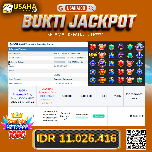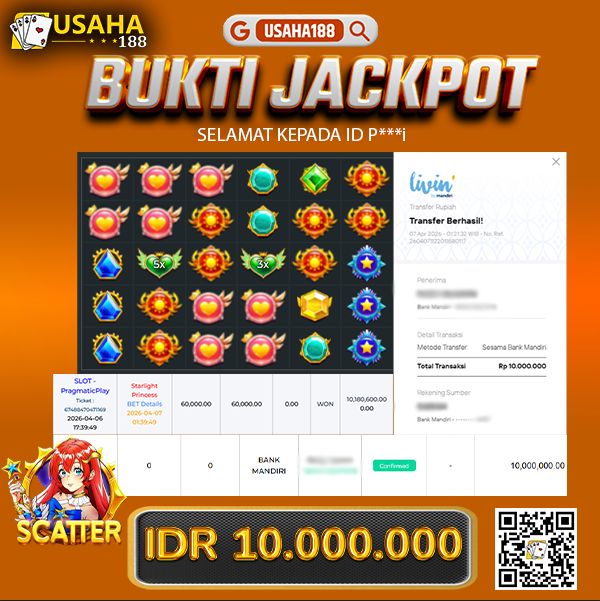 USAHA188 Merupakan Situs Slot Gacor Terpercaya Yang Kembali Menghadirkan Kemenangan Murni Pada Member D***n Pada Permainan Starlight Princess 1000 Dengan Total Kemenangan 25.000.000,- Dibayar Penuh Tanpa Potongan