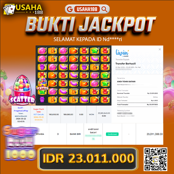USAHA188 Merupakan Situs Slot Gacor Terpercaya Yang Kembali Menghadirkan Kemenangan Murni Pada Member Nd****ri Pada Permainan Sugar Rush 1000 Dengan Total Kemenangan 23.011.000,- Dibayar Penuh Tanpa Potongan