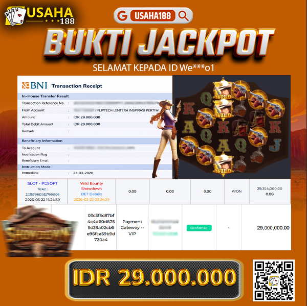 USAHA188 Merupakan Situs Slot Gacor Terpercaya Yang Kembali Menghadirkan Kemenangan Murni Pada Member We***o1 Pada Permainan Wild Bounty Showdown Dengan Total Kemenangan 29.000.000,- Dibayar Penuh Tanpa Potongan