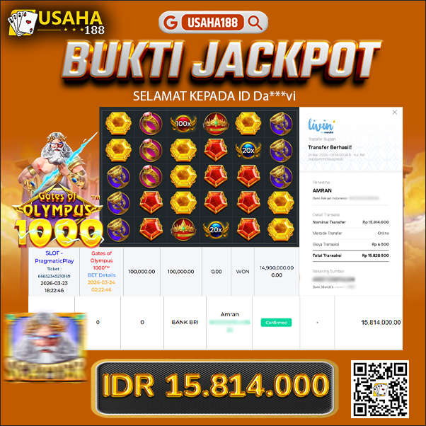 USAHA188 Merupakan Situs Slot Gacor Terpercaya Yang Kembali Menghadirkan Kemenangan Murni Pada Member Da***vi Pada Permainan Gate Of Olympus 1000 Dengan Total Kemenangan 15.814.000,- Dibayar Penuh Tanpa Potongan