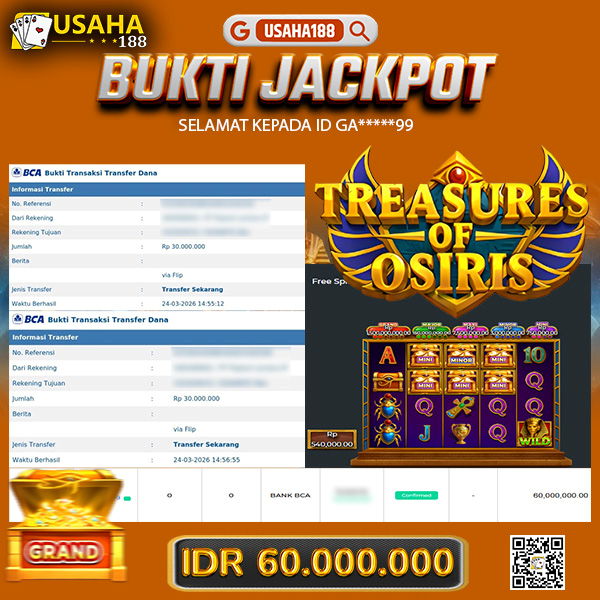 USAHA188 Merupakan Situs Slot Gacor Terpercaya Yang Kembali Menghadirkan Kemenangan Murni Pada Member Ga*****99 Pada Permainan Treasures Of Osiris Dengan Total Kemenangan Rp. 60.000.000,- Dibayar Penuh Tanpa Potongan