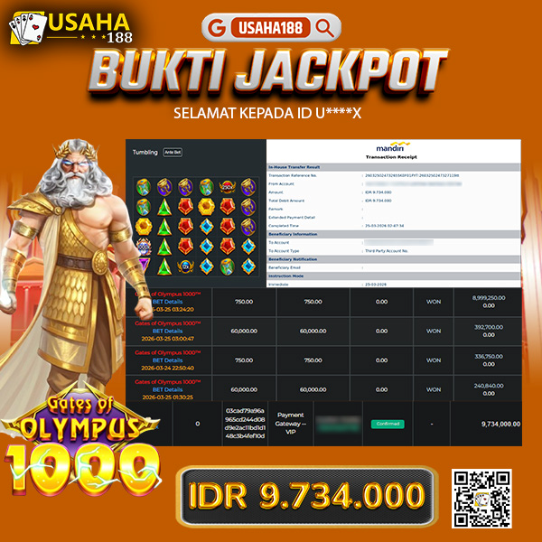 USAHA188 Merupakan Situs Slot Gacor Terpercaya Yang Kembali Menghadirkan Kemenangan Murni Pada Member U*****x Pada Permainan Gates Of Olympus 1000 Dengan Total Kemenangan Rp. 9.734.000,- Dibayar Penuh Tanpa Potongan