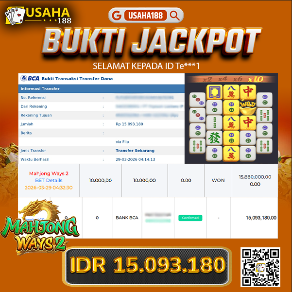 USAHA188 Merupakan Situs Slot Gacor Terpercaya Yang Kembali Menghadirkan Kemenangan Murni Pada Member Te****1 Pada Permainan Mahjong Ways 2 Dengan Total Kemenangan 15.093.180,- Dibayar Penuh Tanpa Potongan