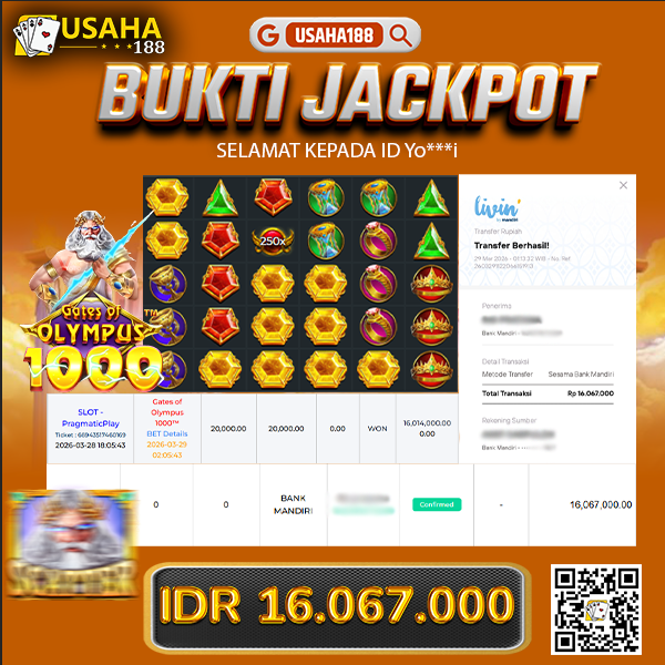 USAHA188 Merupakan Situs Slot Gacor Terpercaya Yang Kembali Menghadirkan Kemenangan Murni Pada Member Yo***i Pada Permainan Gate Of Olympus 1000 Dengan Total Kemenangan 16.067.000,- Dibayar Penuh Tanpa Potongan