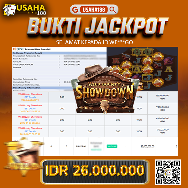 USAHA188 Merupakan Situs Slot Gacor Terpercaya Yang Kembali Menghadirkan Kemenangan Murni Pada Member B*****88 Pada Permainan Wild Bounty Showdown Dengan Total Kemenangan Rp 26.000.000,- Dibayar Penuh Tanpa Potongan