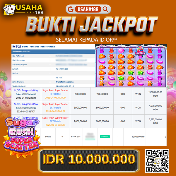 USAHA188 Merupakan Situs Slot Gacor Terpercaya Yang Kembali Menghadirkan Kemenangan Murni Pada Member Or**it Pada Permainan Sugar Rush Super Scatter Dengan Total Kemenangan 10.000.000,- Dibayar Penuh Tanpa Potongan