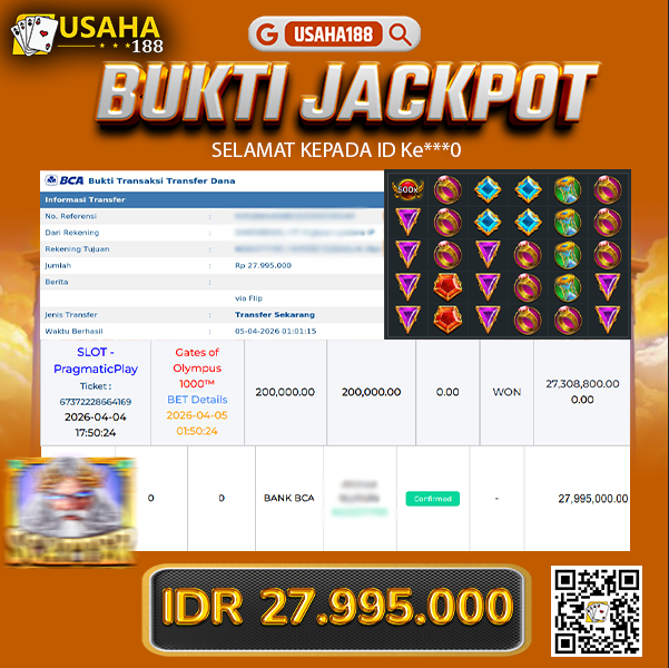 USAHA188 Merupakan Situs Slot Gacor Terpercaya Yang Kembali Menghadirkan Kemenangan Murni Pada Member Ke***0 Pada Permainan Gate Of Olympus 1000 Dengan Total Kemenangan 27.995.000,- Dibayar Penuh Tanpa Potongan