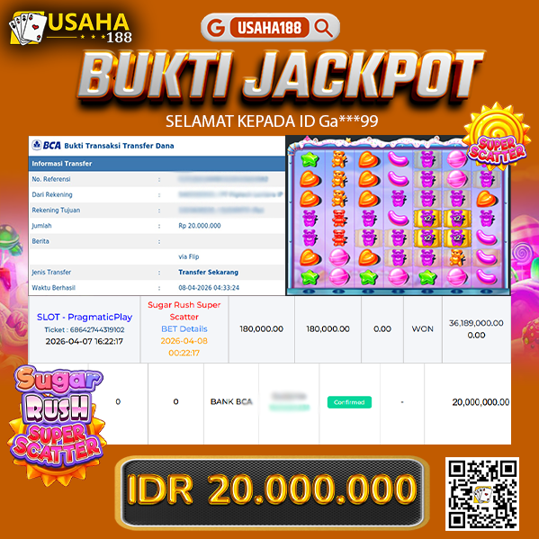 USAHA188 Merupakan Situs Slot Gacor Terpercaya Yang Kembali Menghadirkan Kemenangan Murni Pada Member Ga***99 Pada Permainan Sugar Rush Super Scatter Dengan Total Kemenangan 20.000.000,- Dibayar Penuh Tanpa Potongan