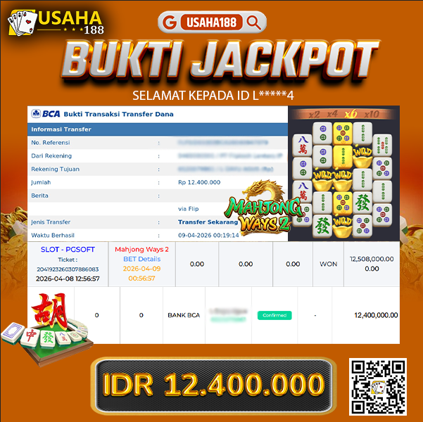 USAHA188 Merupakan Situs Slot Gacor Terpercaya Yang Kembali Menghadirkan Kemenangan Murni Pada Member L****4 Pada Permainan Mahjong Ways 2 Dengan Total Kemenangan 12.400.000,- Dibayar Penuh Tanpa Potongan
