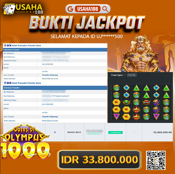 USAHA188 Merupakan Situs Slot Gacor Terpercaya Yang Kembali Menghadirkan Kemenangan Murni Pada Member Uj******500 Pada Permainan Gates Of Olympus 1000 Dengan Total Kemenangan Rp. 33.800.000,- Dibayar Penuh Tanpa Potongan