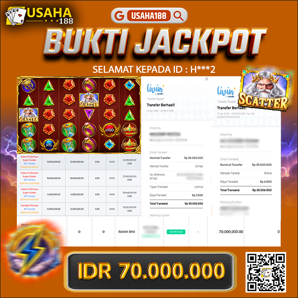 USAHA188 Merupakan Situs Slot Gacor Terpercaya Yang Kembali Menghadirkan Kemenangan Murni Pada Member H***2 Pada Permainan Gate Of Olympus Super Scatter Dengan Total Kemenangan 70.000.000,- Dibayar Penuh Tanpa Potongan