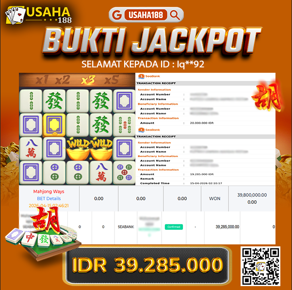 USAHA188 Merupakan Situs Slot Gacor Terpercaya Yang Kembali Menghadirkan Kemenangan Murni Pada Member Iq**92 Pada Permainan Mahjong Ways Dengan Total Kemenangan 39.285.000,- Dibayar Penuh Tanpa Potongan