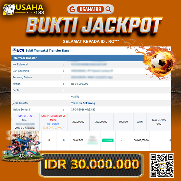 USAHA188 Merupakan Situs Slot Gacor Terpercaya Yang Kembali Menghadirkan Kemenangan Murni Pada Member Ro*** Pada Permainan Sports Bti Dengan Total Kemenangan 30.000.000,- Dibayar Penuh Tanpa Potongan