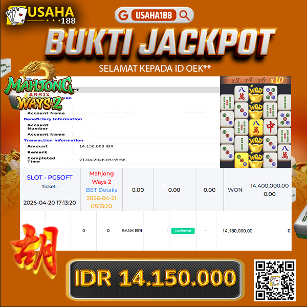 USAHA188 Merupakan Situs Slot Gacor Terpercaya Yang Kembali Menghadirkan Kemenangan Murni Pada Member Oek** Pada Permainan Mahjong Ways 2 Dengan Total Kemenangan 14.150.000,- Dibayar Penuh Tanpa Potongan