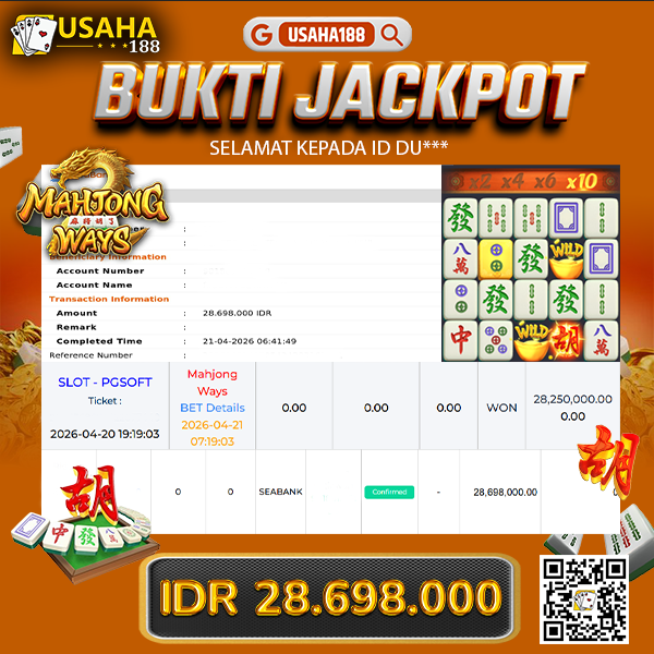 USAHA188 Merupakan Situs Slot Gacor Terpercaya Yang Kembali Menghadirkan Kemenangan Murni Pada Member Du*** Pada Permainan Mahjong Ways Dengan Total Kemenangan 28.698.000,- Dibayar Penuh Tanpa Potongan
