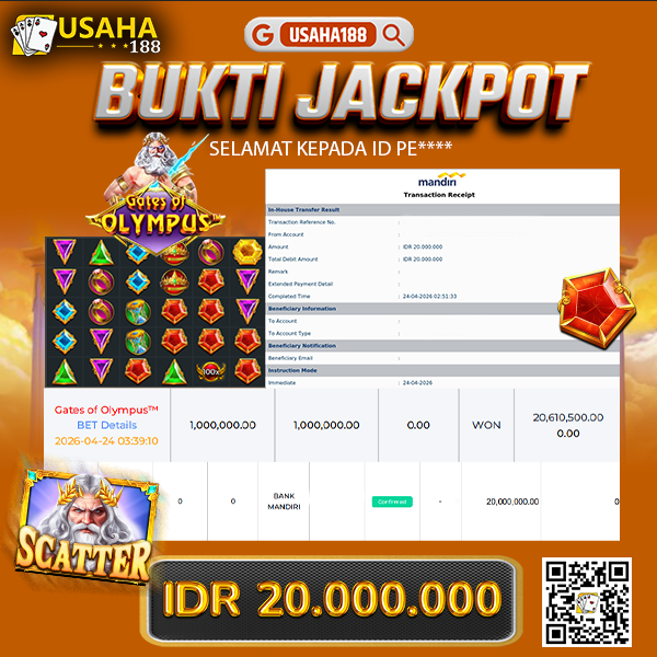 USAHA188 Merupakan Situs Slot Gacor Terpercaya Yang Kembali Menghadirkan Kemenangan Murni Pada Member Pe**** Pada Permainan Gate Of Olympus Dengan Total Kemenangan 20.000.000,- Dibayar Penuh Tanpa Potongan