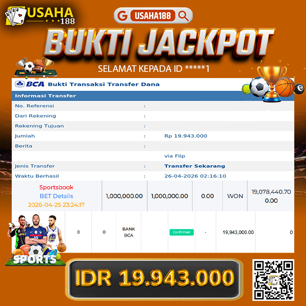 USAHA188 Merupakan Situs Slot Gacor Terpercaya Yang Kembali Menghadirkan Kemenangan Murni Pada Member *****1 Pada Permainan Sportsbook Dengan Total Kemenangan 19.943.000,- Dibayar Penuh Tanpa Potongan