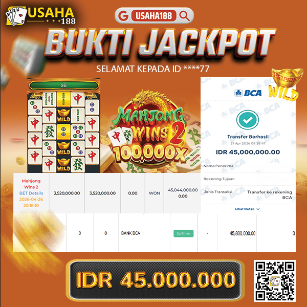 USAHA188 Merupakan Situs Slot Gacor Terpercaya Yang Kembali Menghadirkan Kemenangan Murni Pada Member ****77 Pada Permainan Mahjong Wins 2 Dengan Total Kemenangan 45.000.000,- Dibayar Penuh Tanpa Potongan
