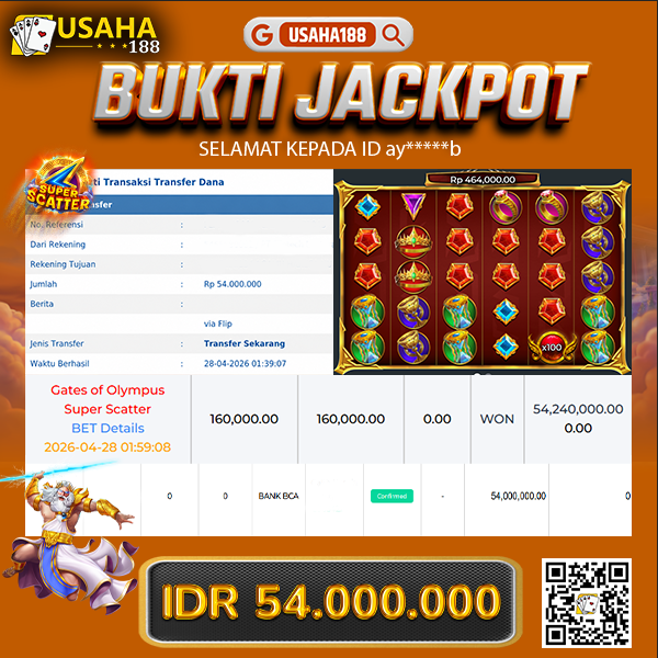 USAHA188 Merupakan Situs Slot Gacor Terpercaya Yang Kembali Menghadirkan Kemenangan Murni Pada Member Ay*****b Pada Permainan Gates Of Olympus Super Scatter Dengan Total Kemenangan 54.000.000,- Dibayar Penuh Tanpa Potongan
