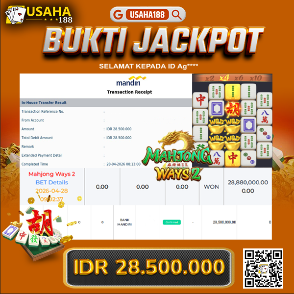 USAHA188 Merupakan Situs Slot Gacor Terpercaya Yang Kembali Menghadirkan Kemenangan Murni Pada Member Mia******* Pada Permainan Mahjong Ways Dengan Total Kemenangan RP. 28.000.000,- Dibayar Penuh Tanpa Potongan